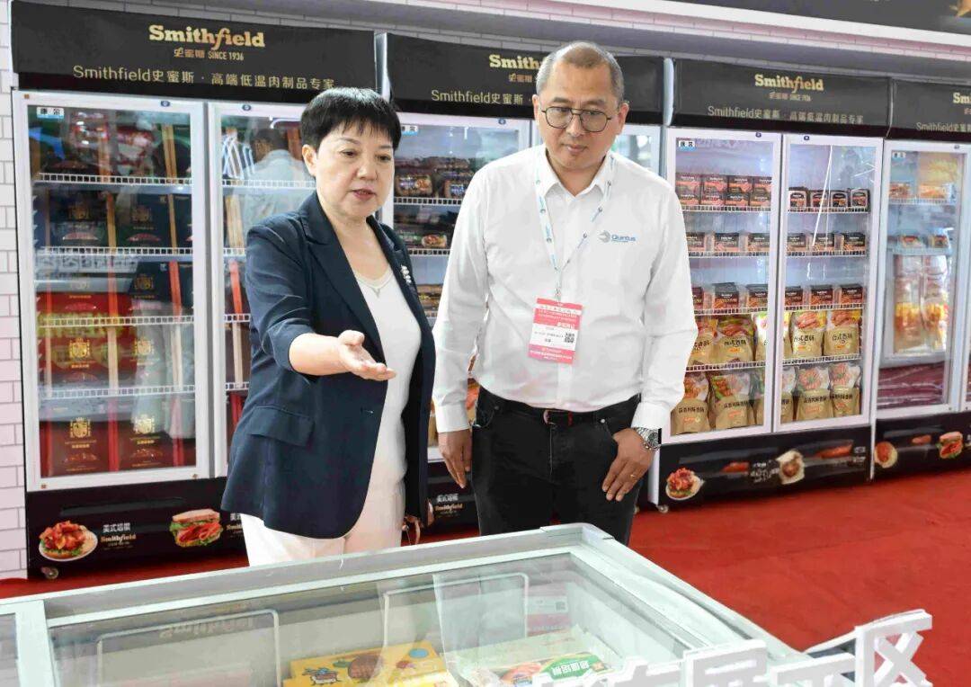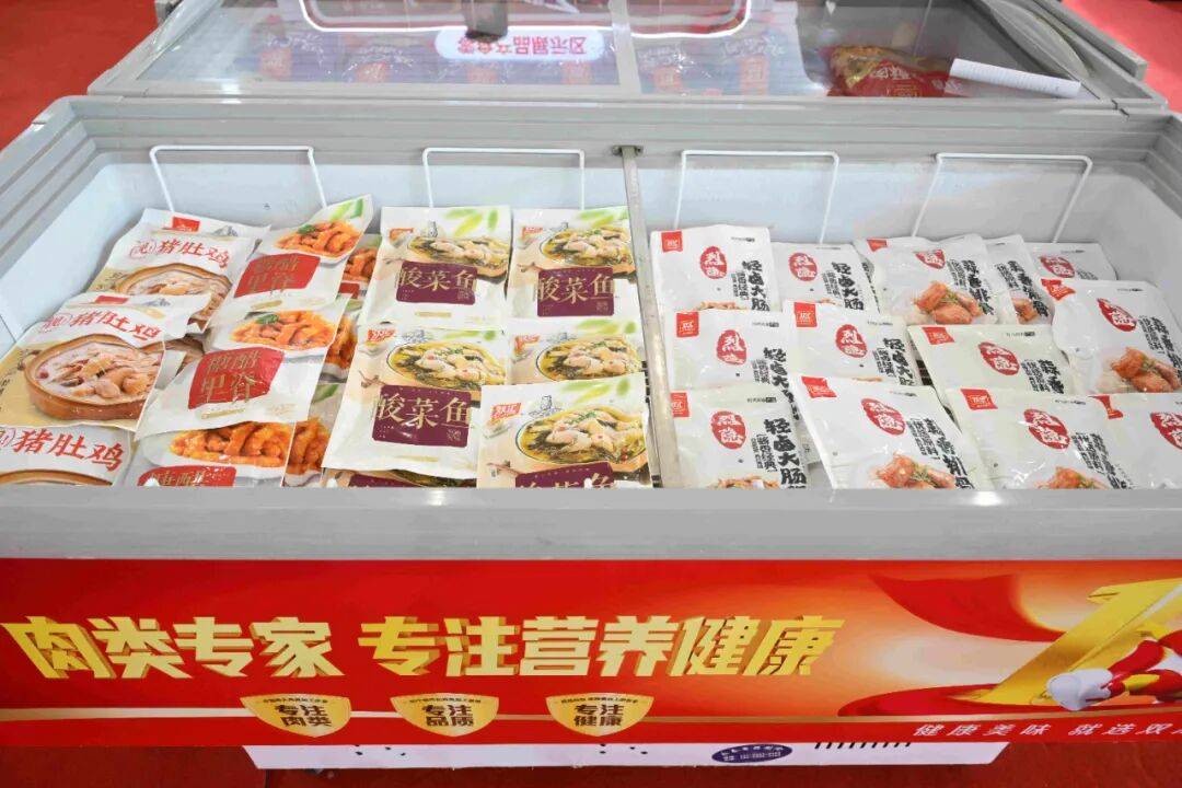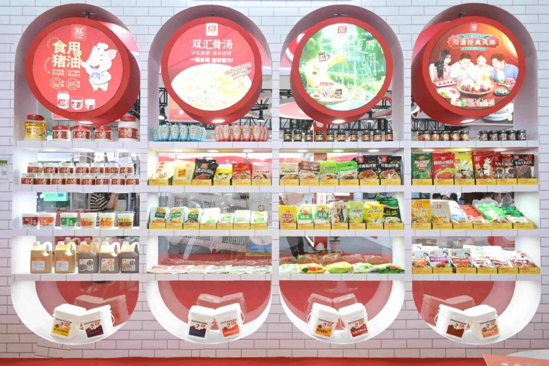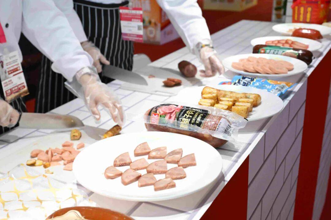 双汇展厅内的展品琳琅满目、品类丰富,我们可以看到企业对肉类美食的探索,早已从“一支火腿肠”拓展出更多可能。仅肉制品就涵盖了简颂午餐肉、金沙蛋黄肠、猪腱子肉火腿、富乐卤味肠等特色产品系列,焦香蜜汁肠、塞纳诺火腿、山核桃木烟熏原切培根、萨纳齐琼香肠等史蜜斯系列,玉米肉枣肠、脆骨肉条香肠、火爆小郡肝等汇小铺零食系列,卤福斋中式产品礼盒系列,招牌面、香菇鸡丁米线、酸辣粉等方便速食系列。