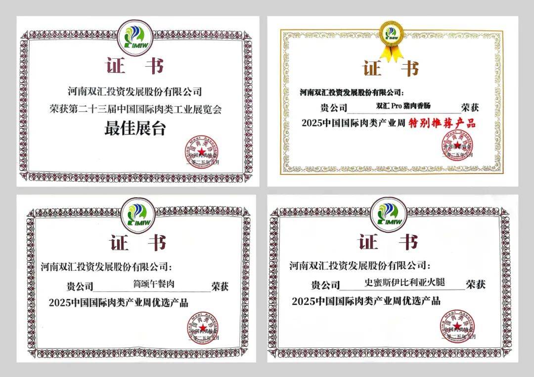 展会上,双汇荣获第二十三届中国国际肉类工业展览会“最佳展台”。双汇Pro猪肉香肠荣获“2025中国国际肉类产业周特别推荐产品”,简颂午餐肉、史蜜斯伊比利亚火腿荣获“2025中国国际肉类产业周优选产品”。